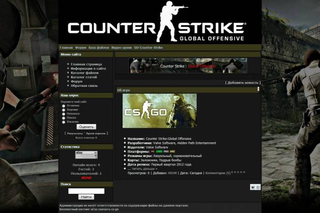 На данный момент вы просматриваете краткое описание файла Шаблон на тему Counter Strike Global Offensive, данный файл принадлежит категории Шаблоны для сайта ucoz. Материал Шаблон на тему Counter Strike Global Offensive опубликован 10.03.2012. Помимо данного материала у нас еще много других файлов схожих по меткам в разделе . Копирования материала с сайта строго Запрещено